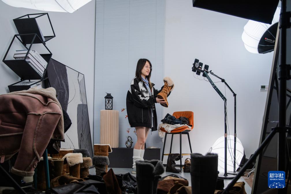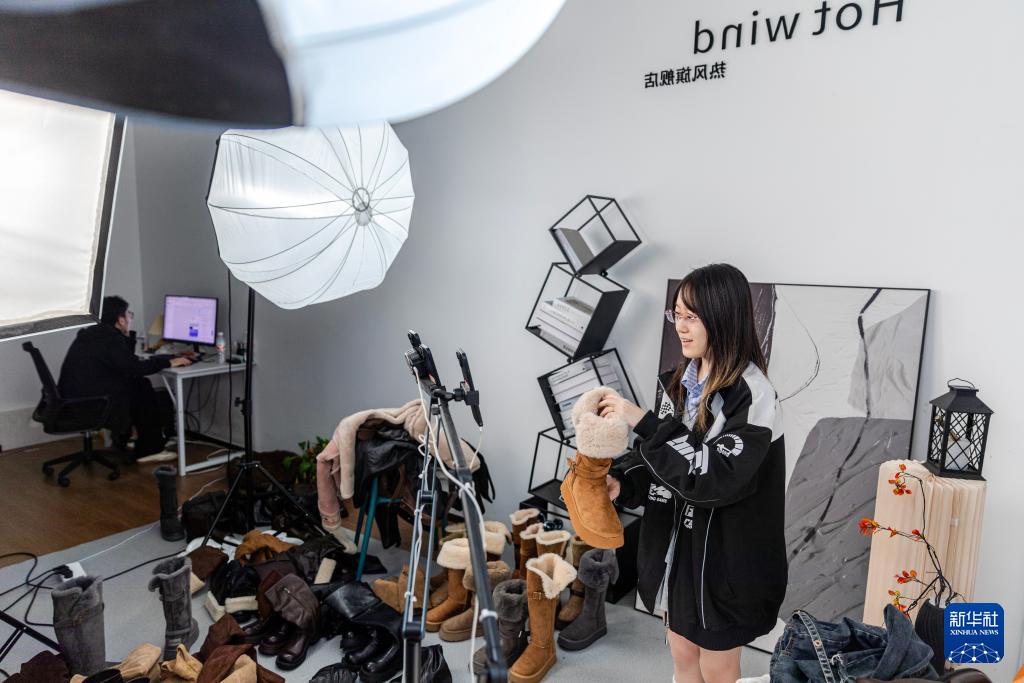 11月10日,在浙江省温州市瓯海区的一家网络科技公司,主播通过网络直播销售鞋子。