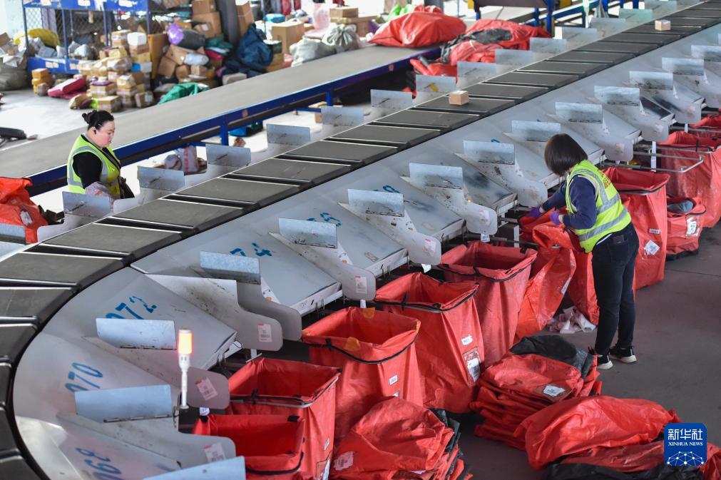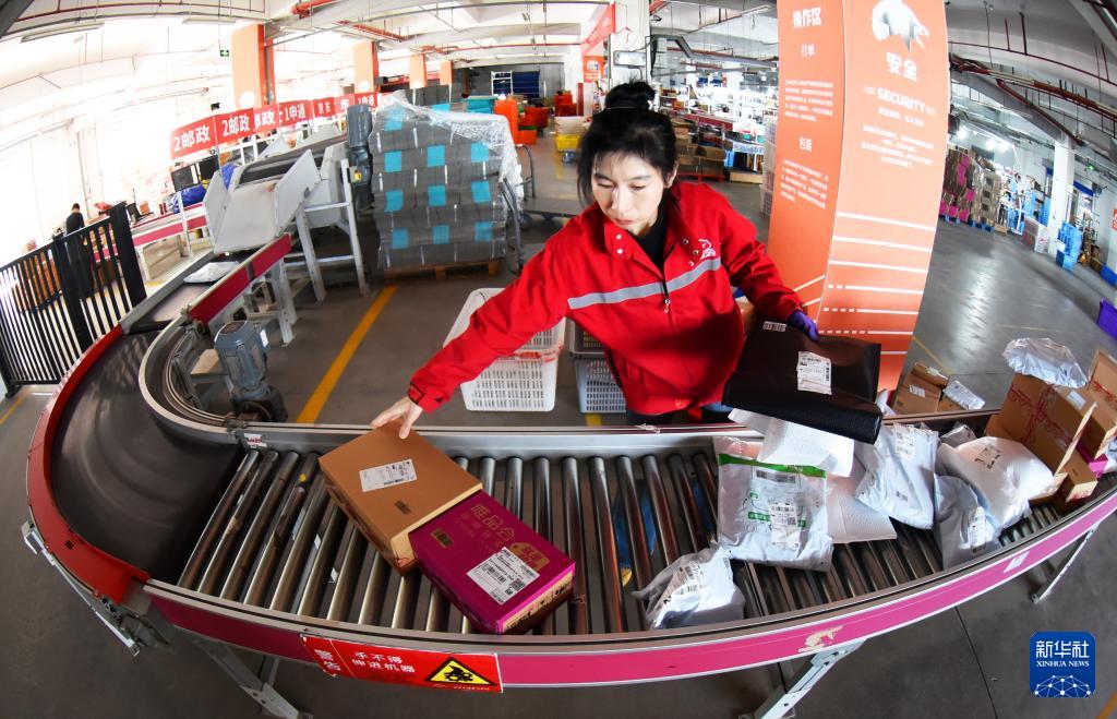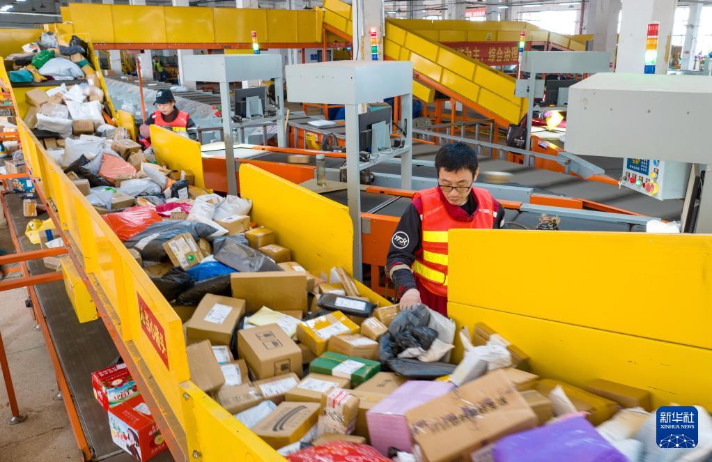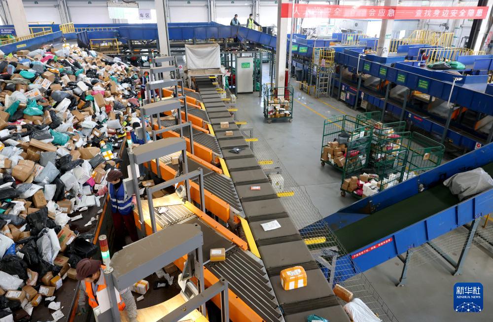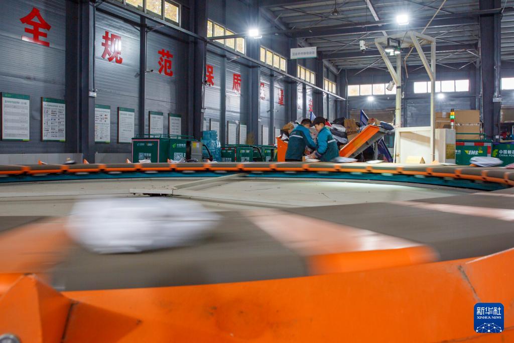 11月10日,工作人员在中国邮政集团有限公司山东枣庄市分公司寄递事业部网路运营中心分拣快递。