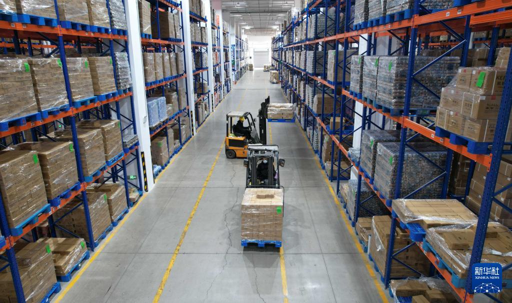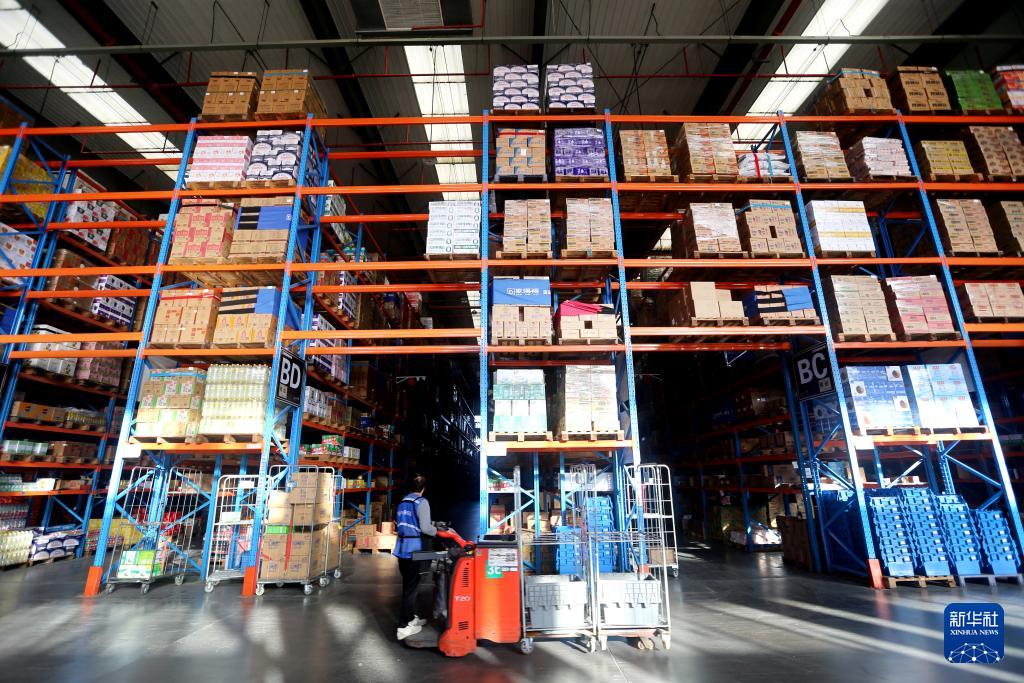 11月10日,在山东省临沂市沂南县铜井镇宠物食品产业园,工人驾驶叉车进行出货作业(无人机照片)。