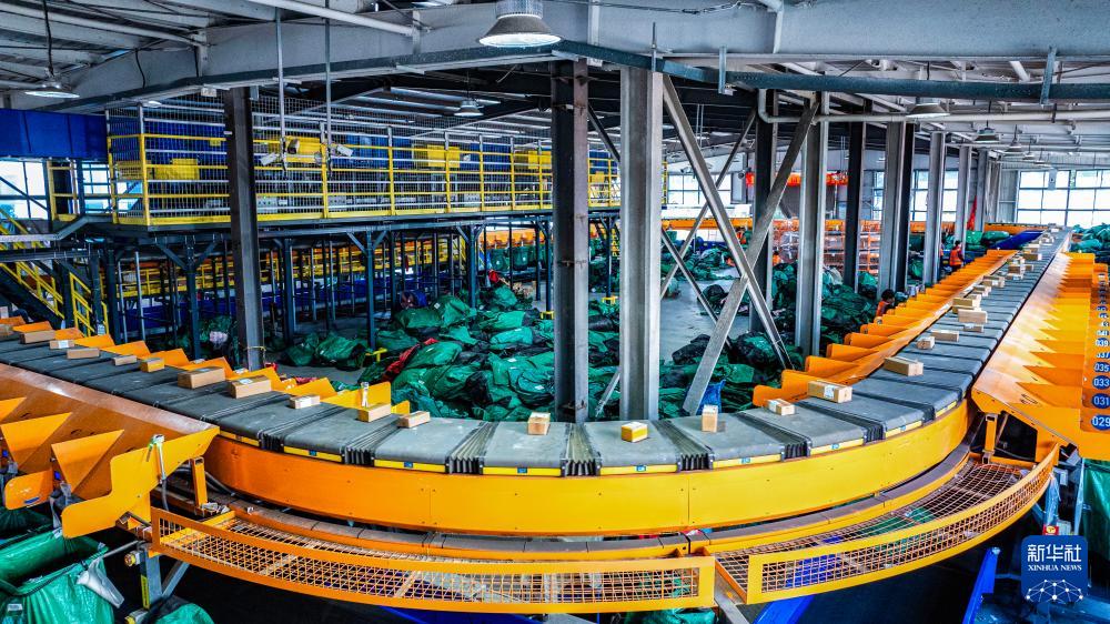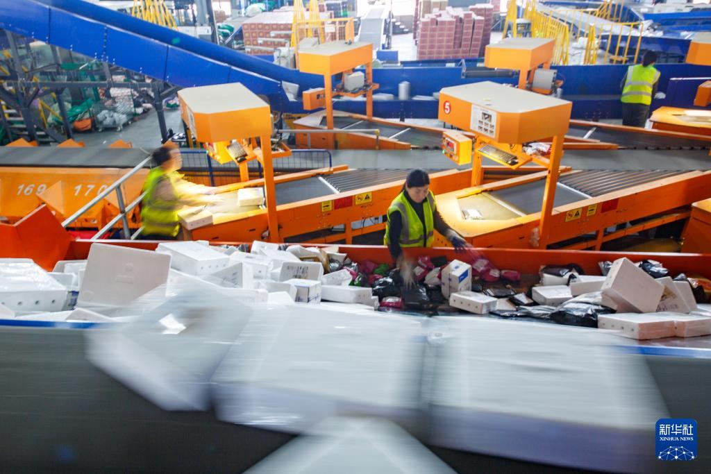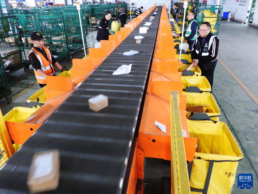 11月10日,工作人员在浙江省乐清市柳市镇韵达快递分拣中心全自动流水线上分拣快递包裹。