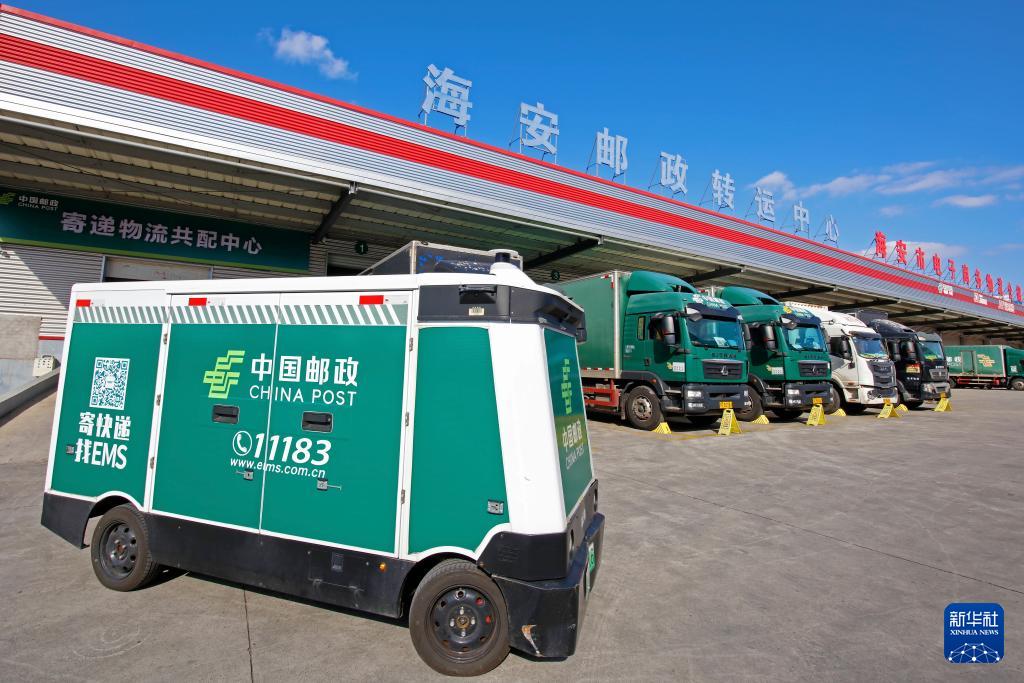 11月10日,在位于江苏海安商贸物流产业园的海安市邮政转运中心,无人配送车将快递包裹运往城区揽投部。