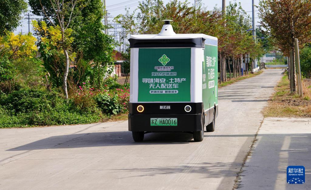 11月10日,在江苏省海安市墩头镇长垎村,一辆载有快递包裹的无人快递配送车行驶在村道上。