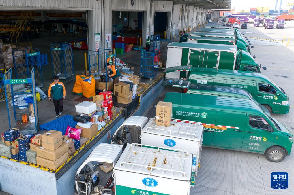 11月10日,在浙江省湖州市长兴县三点一线商贸物流共配中心,工作人员忙着将快递装车外运。