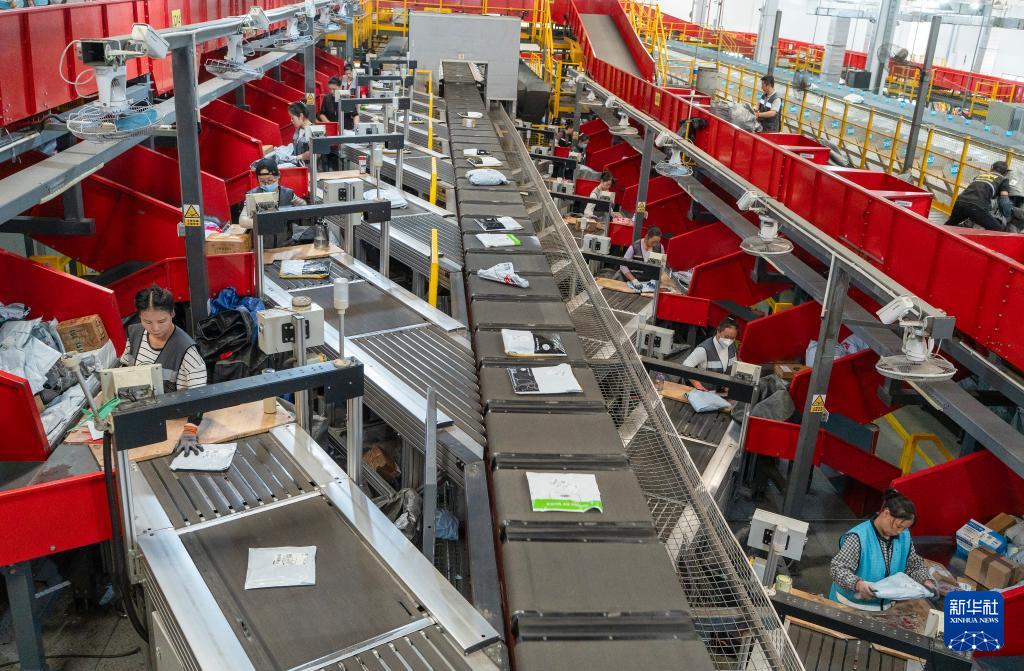 11月10日,在中国邮政速递物流股份有限公司四川省达州市分公司邮件处理分局,工作人员在智能快递流水线上分拣快递邮件。