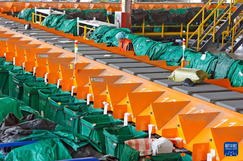 11月10日,在位于江苏海安商贸物流产业园的海安市邮政转运中心,工作人员分拣快递包裹。