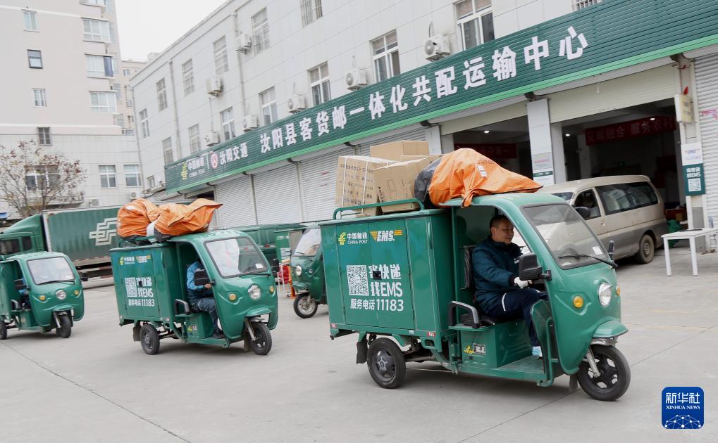 11月10日,在中国邮政集团有限公司河南省汝阳县分公司邮件处理中心,员工们给用户送快递。