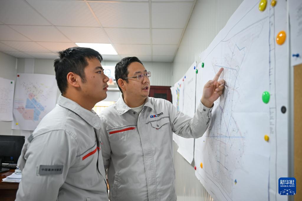 2025年9月9日,在科威特阿卜杜拉新城项目地,中国能建葛洲坝集团员工查看项目规划图。