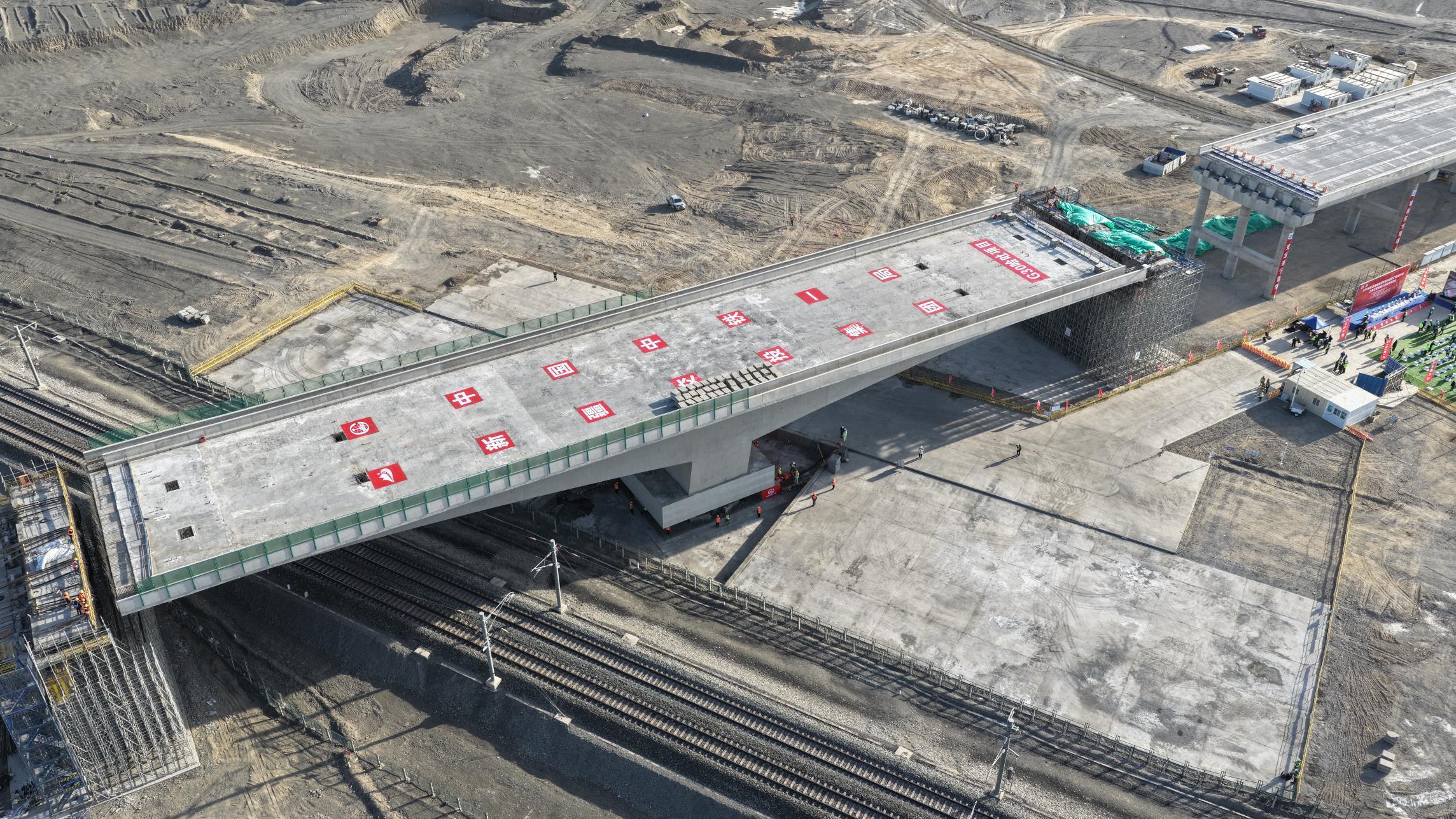 “提前浇筑完成的两跨65米的桥梁,重达2万吨。因桥梁体量大,跨铁路运营线,精度要求高,转体施工难度大,经过多次研讨与论证,我们决定采用转体法工艺施工,并采用撑脚钢楔、封固钢筋焊接锁定施工,实现桥梁建设与铁路通行的‘零干扰’。”该标段项目负责人刘先军说。