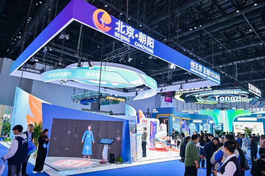 北京朝阳展区紧扣“创无界 正朝YOUNG”主题,以“凤凰展翅”为设计理念,通过数字人、智能交互等多元形式,打造了四大核心板块。其中,“让科技点亮朝阳”板块集中展现了朝阳区“商务+科技”双轮驱动的发展成果。2025年上半年,信息服务业、科技服务业增加值合计占GDP比重达25.8%,科技服务业实现营收、拉动力“全市双第一”。