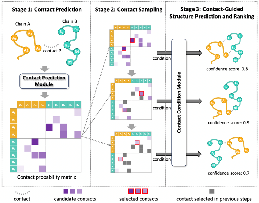 生命活动依赖于蛋白质与化合物、RNA、抗原抗体等生物分子间的精准结合,解析分子间的三维结构是药物设计、疫苗研发等场景的核心。数年来,蛋白质结构预测始终是生命科学领域的重大机遇和挑战。尽管国内外已有多款生物分子结构预测模型能够较为准确地预测单个蛋白质和复合体间的结构,但像AlphaFold3这类模型,大多依赖大规模盲采的传统方法,即通过“广撒网”生成海量结构,再从中筛选最优解,面对缺乏共进化信息的新型分子或复合物的结合模式未见过的情况时,常因方向不明导致冗余采样与预测失败,预测效率低、精度不足。