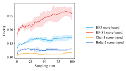得益于接触感知采样策略,HelixFold-S1在性能上实现了突破性提升。在实际测试中,HelixFold-S1普遍比前代模型表现更好,在较难的抗原抗体场景上提升尤为明显,实测数据显示,对比base版本,HelixFold-S1在该场景下预测精度提升58%,对比Chai-1和Boltz-2分别提升80%和56%。同时,随着取样步数的增加,HelixFold-S1获取更优质构象的概率也在不断增加,相比其他方法提升空间更显著。