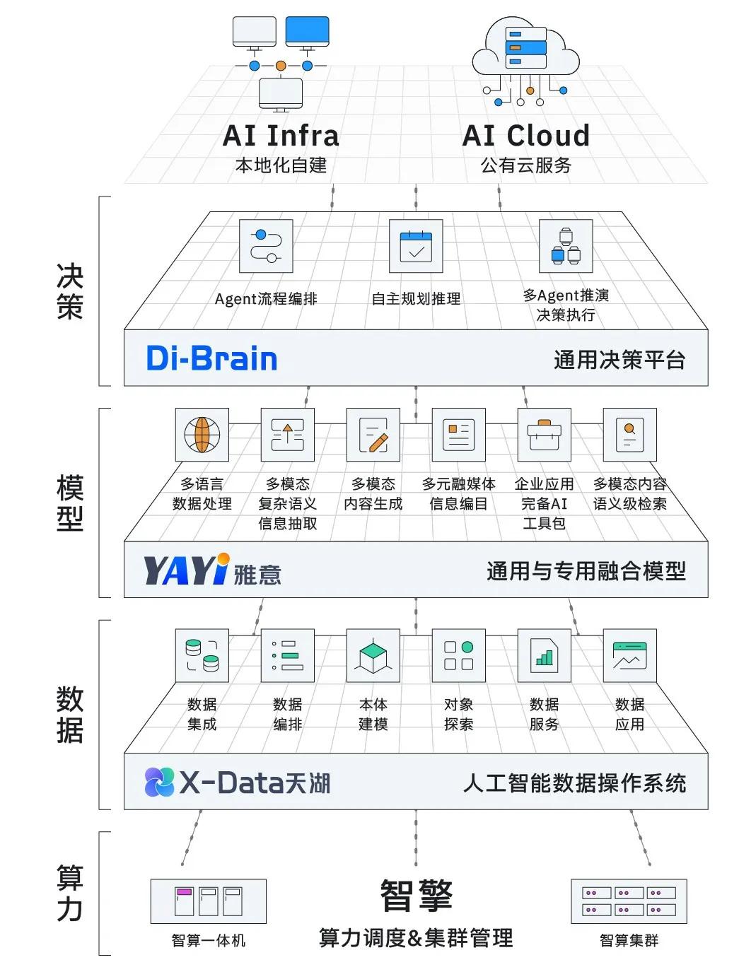 在模型层面,DIOS行业级大模型,让AI真正理解业务。内置通专融合的雅意系列模型,DIOS具备多语言、多模态处理能力,在跨语言理解、复杂信息抽取、内容生成、行业数据增强、智能任务规划等方面表现领先,兼具高迁移性与算力调度效率。此外,平台融合中国科学院磐石科学基础大模型与自研D1决策大模型,提供“科学思维+决策推演”的智能力,支撑多行业复杂场景智能应用。
