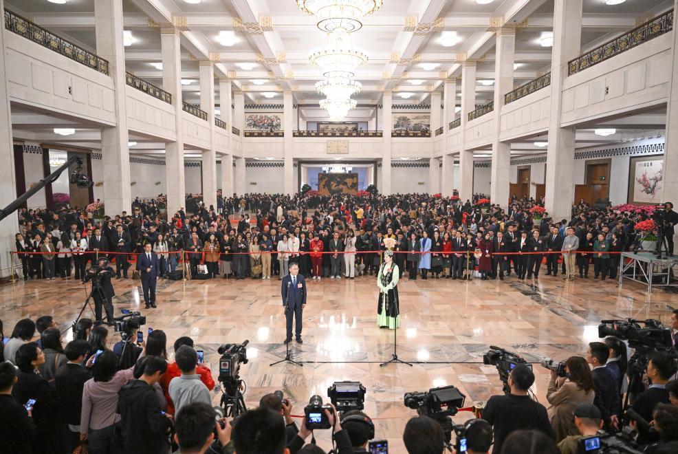 闭幕会前,人民大会堂中央大厅北侧,第三场“代表通道”集体采访活动正在进行。