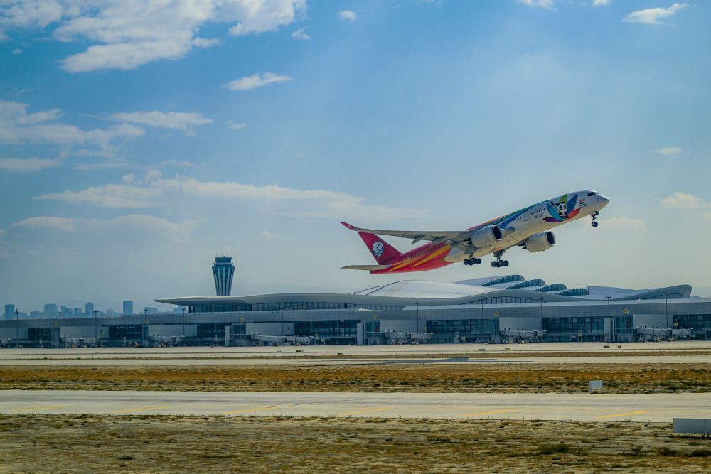 9月15日,一架飞机从乌鲁木齐天山国际机场起飞。新华社记者 陈朔 摄