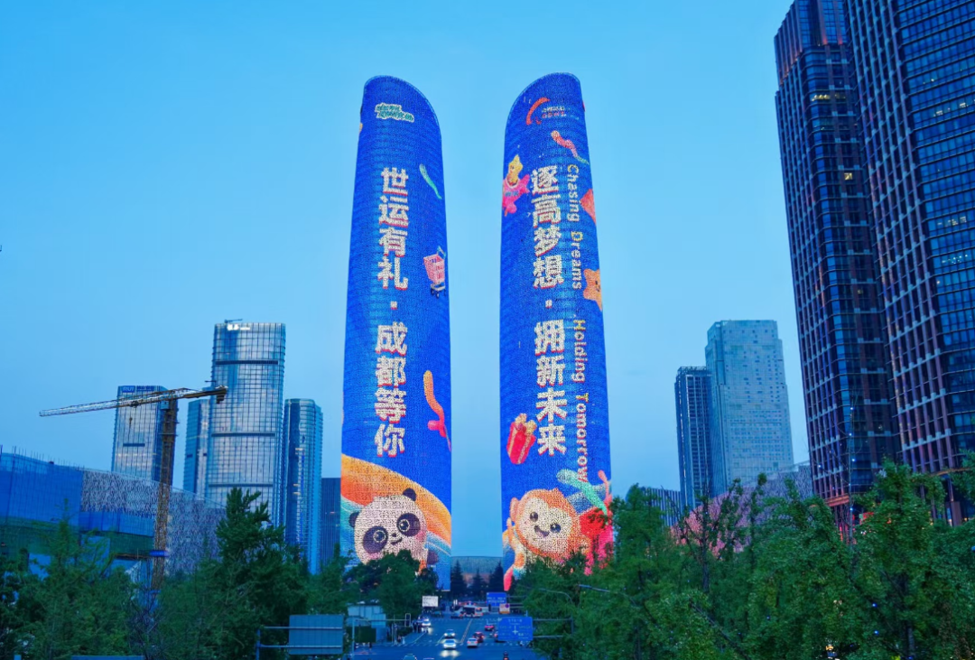 除了巨幅数字长屏“天府大屋檐”,位于成都高新区交子大道、高218米的“封面地标”——天府双塔的“光影外衣”也由京东方打造。其外立面金属框架采用京东方全球领先的显示技术,由京东方定制的LED金属灯条屏组成,灯条长度达16.2万米,屏幕面积达到5.2万平方米,实现800万像素点的高清显示。