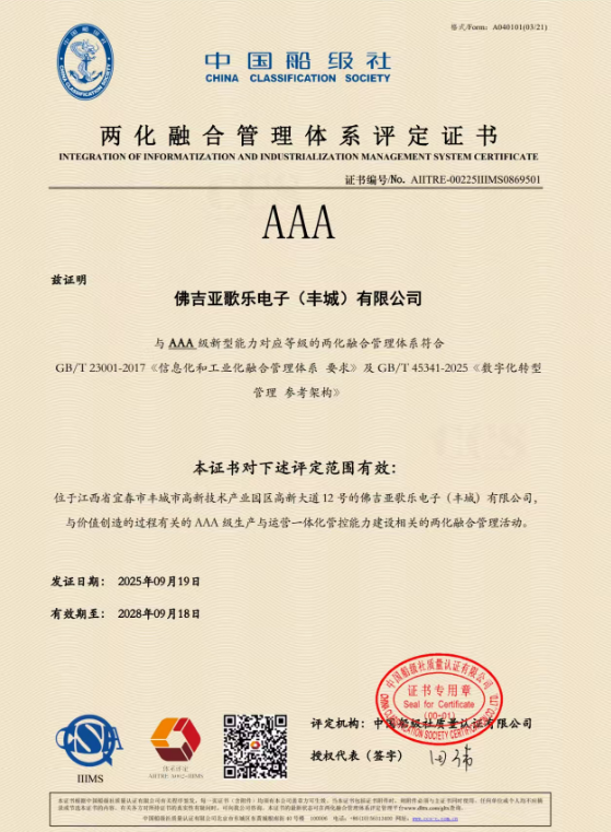 两化融合是信息化和工业化高层次的深度结合,两化融合管理体系是我国首个覆盖两化融合全局、全要素、全过程的管理体系标准。AAA级认证是两化融合管理体系开放申请的最高评定等级,代表企业在数字化转型中已达到“领域级”领先水平。此次通过认证,不仅彰显了佛吉亚歌乐在智能制造与数字化管理方面的硬实力,更标志着宜春丰城高新区在推进两化深度融合方面迈上了新台阶。