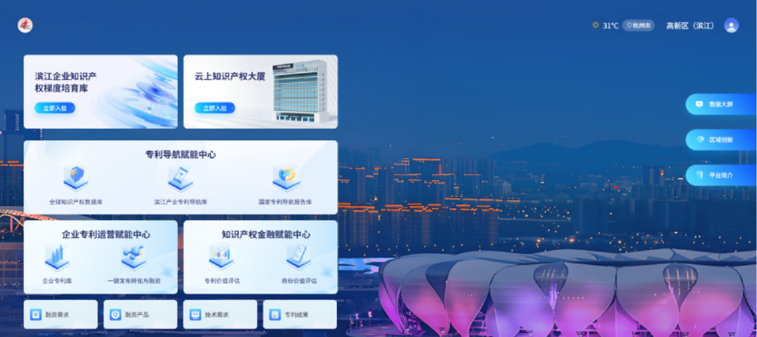 平台智慧赋能。搭建AI智能服务平台,集成“专利导航”“企业专利运营”“知识产权金融”三大赋能中心,实现专利智能匹配、价值评估和金融产品在线对接,目前已上线61款知识产权金融产品。