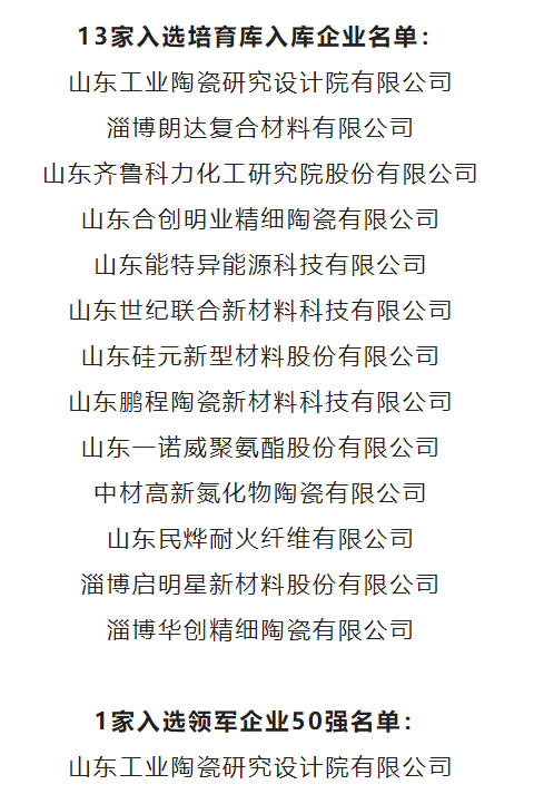 近日,山东省工业和信息化厅公示了2025年度山东省新材料领军企业培育库入库名单和50强名单,淄博高新区13家企业入选培育库入库企业,比去年增加4家。其中,山东工业陶瓷研究设计院有限公司成功入选新材料领军企业50强。