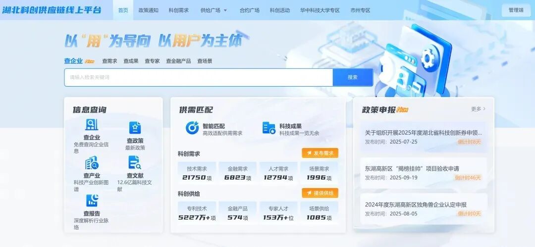 湖北科创供应链平台是湖北重点打造的科技创新资源与产业需求高效对接平台。平台聚焦“天网”“地网”“政策网”“金网”建设,线上平台访问量已突破2900万次,入驻用户约11.5万个,完成超1.8万项供需匹配,为科创企业提供技术、金融等全要素服务。