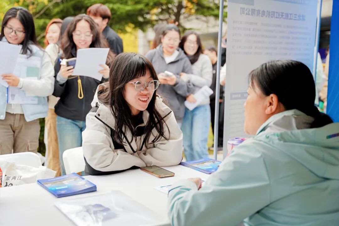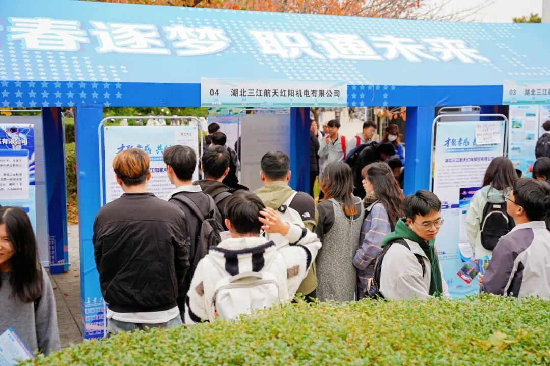 在招聘环节,学生们踊跃围在各企业展位前咨询岗位详情、投递简历。孝感高新区华工高理电子有限公司、湖北航天三江红阳机电有限公司、航天重型工程装备有限公司、湖北职业技术学院、汉川市事业单位等15家单位,为学子们提供涵盖机械、电子、材料、软件、教育、管理等领域的上千个优质岗位,受到学子广泛关注。现场气氛热烈,交流深入,不少学生与企业HR一对一沟通,详细了解岗位要求与发展路径。