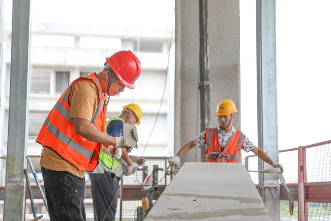 在项目建设现场,多辆登高车、挖掘机等机械来回作业,180余名工人在各个作业面上施工,正紧锣密鼓地进行玻璃幕墙、室内精装修、园林绿化等工作,一派繁忙。自项目正式建设以来,核心团队坚持“节假日不停工”锚定目标忙生产,结合项目特点,树立快速建造、优质履约的理念,认真编制各种施工方案,坚持设计引领、技术先行,使得项目整体进度、施工质量、文明施工等全处于受控状态。