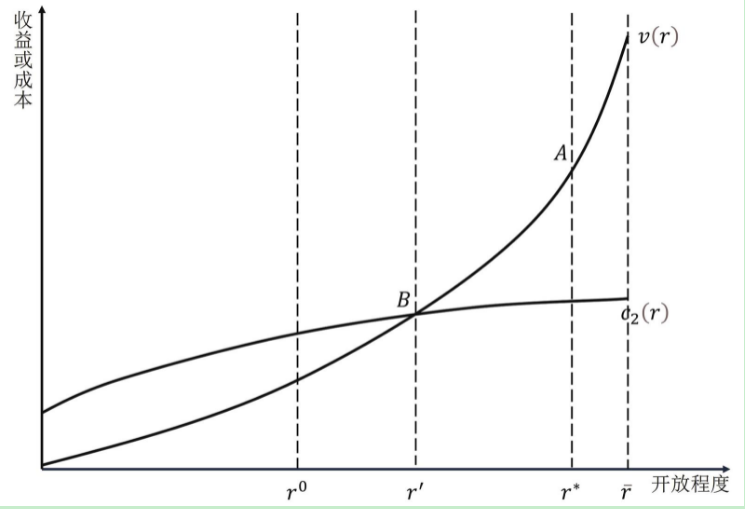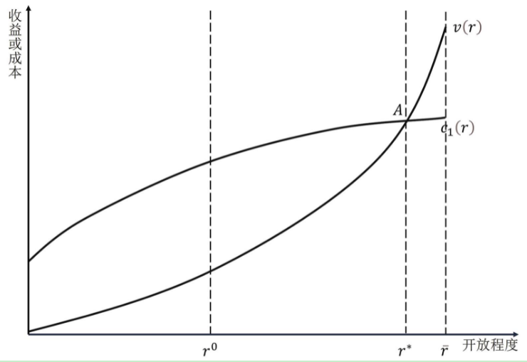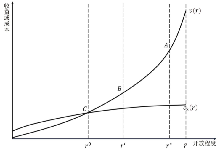 通过简单的成本收益模型,可以解释当前公共数据开放程度不足的原因。假设公共数据开放的社会收益为υ(r),成本为с(r),其中,r为公共数据的开放程度, 为因安全和隐私限制所能达到的开放上限。