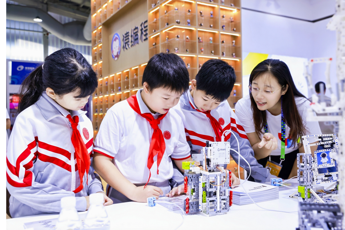 在科技氛围浓厚的教育展区,观众不仅能够亲身体验系列创新产品,还能切身体会到AI教育的乐趣。更值得关注的是,猿编程在服贸会首次推出了具有剧场式互动的“科技少年AI课堂”,为现场观众呈现了一场沉浸式科技教育盛宴。