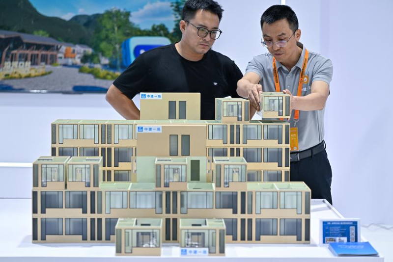 9月13日,参观者在服贸会首钢ios版怎么下载taptap中建一局展台观看预制混凝土结构箱式房屋建筑模型,该建造技术具有模块化设计、工厂化加工、一体化装修等优势,大大缩短施工周期。新华社记者 李鑫 摄