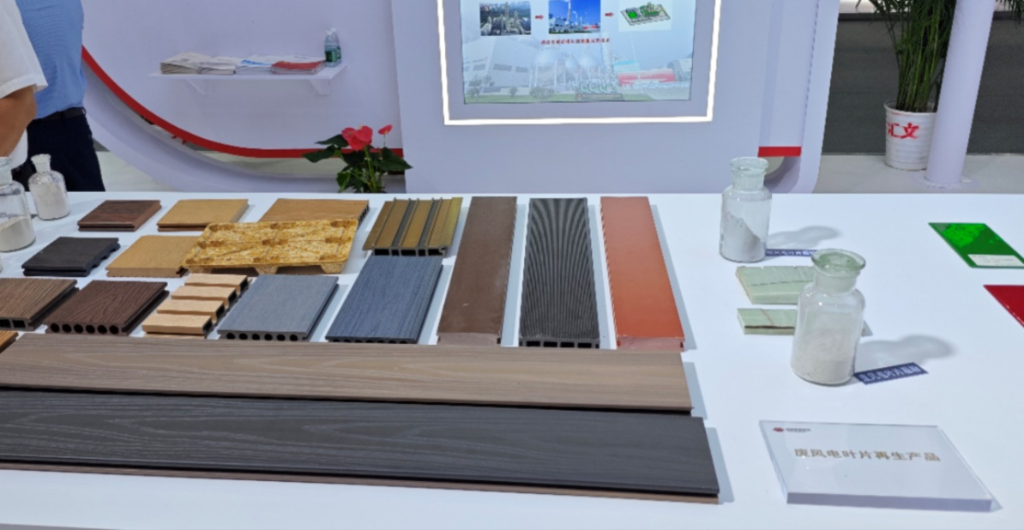在服贸会国能龙源环保有限公司展厅,有一些看上去平平无奇的板材,它们的原型却有点特别,是曾服役蓝天的“大家伙”——退役风电叶片。