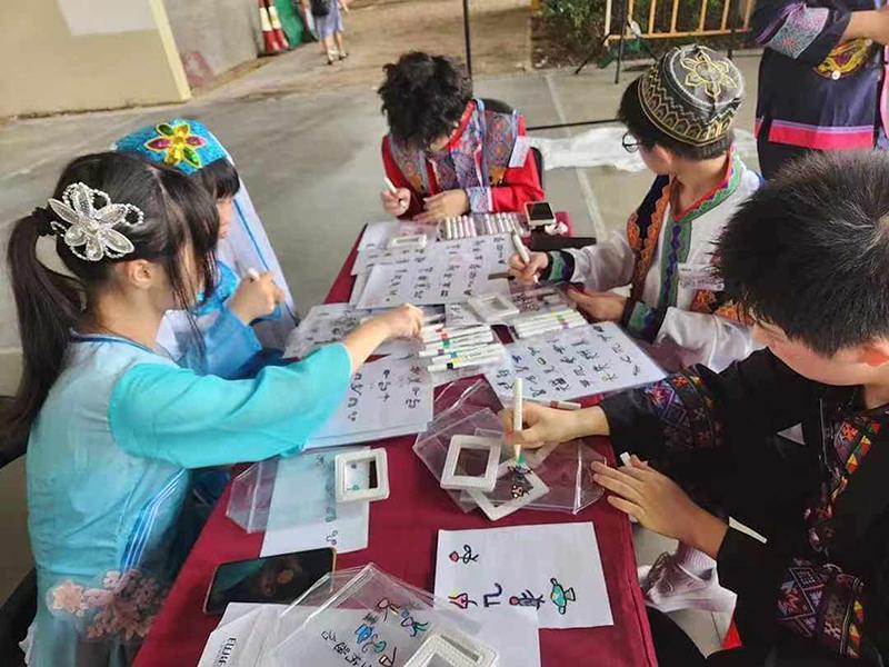 9月28日,在香港观塘海滨公园,身穿民族服饰的青少年体验非遗文化。新华社发(受访者供图)