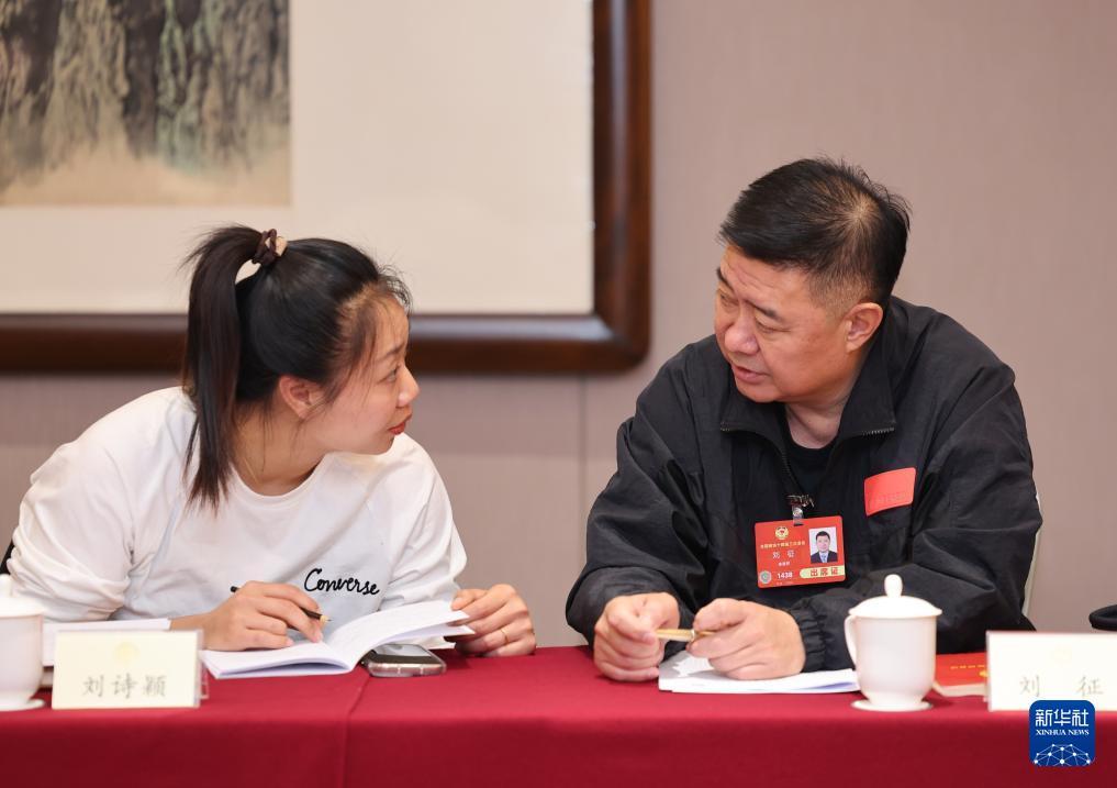 3月5日,全国政协委员刘诗颖(左)与刘征交流。