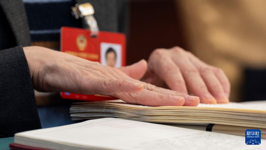 3月5日,在全国政协十四届三次会议社会福利和社会保障界别小组会议现场,政协委员触摸盲文版政府工作报告。