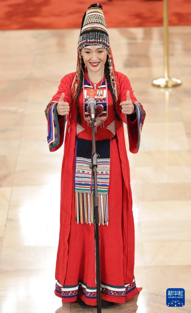 3月7日,全国政协十四届三次会议第二场“委员通道”集体采访活动在北京人民大会堂举行。这是全国政协委员杨钰尼接受媒体采访。