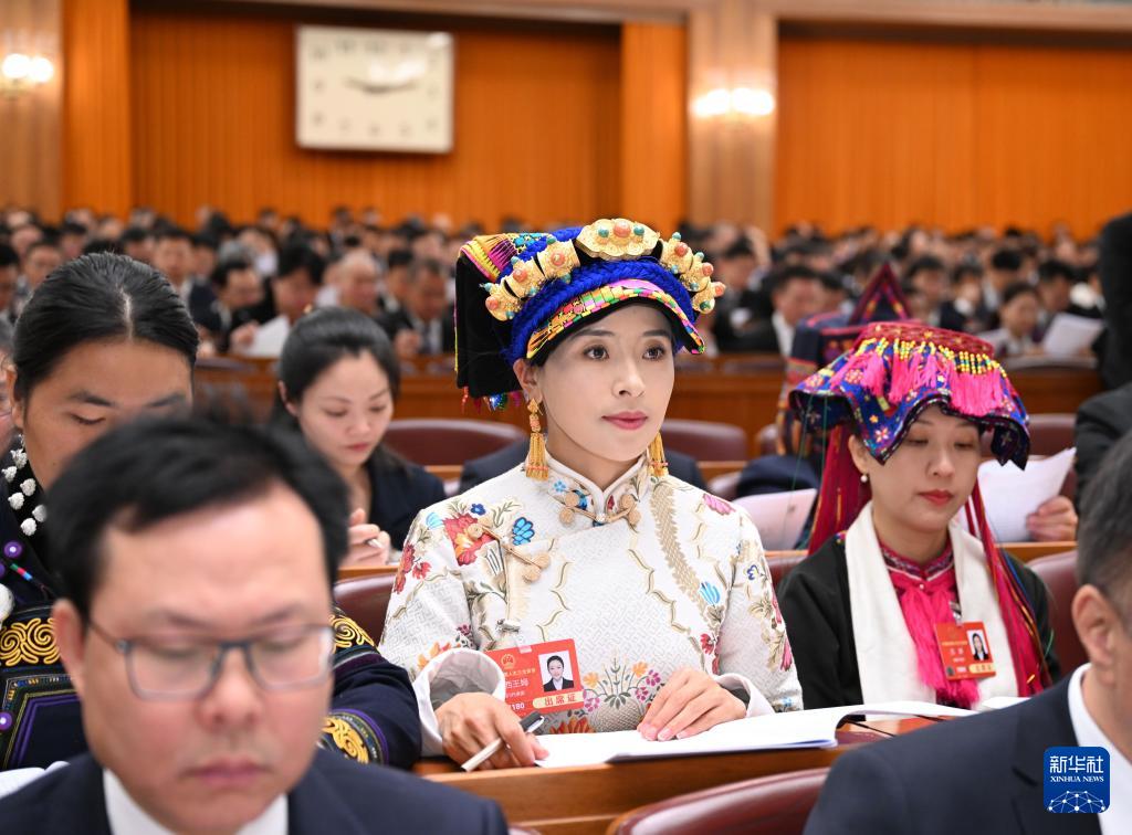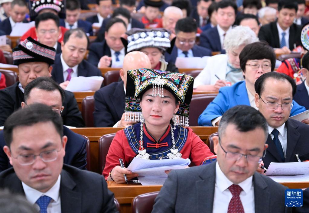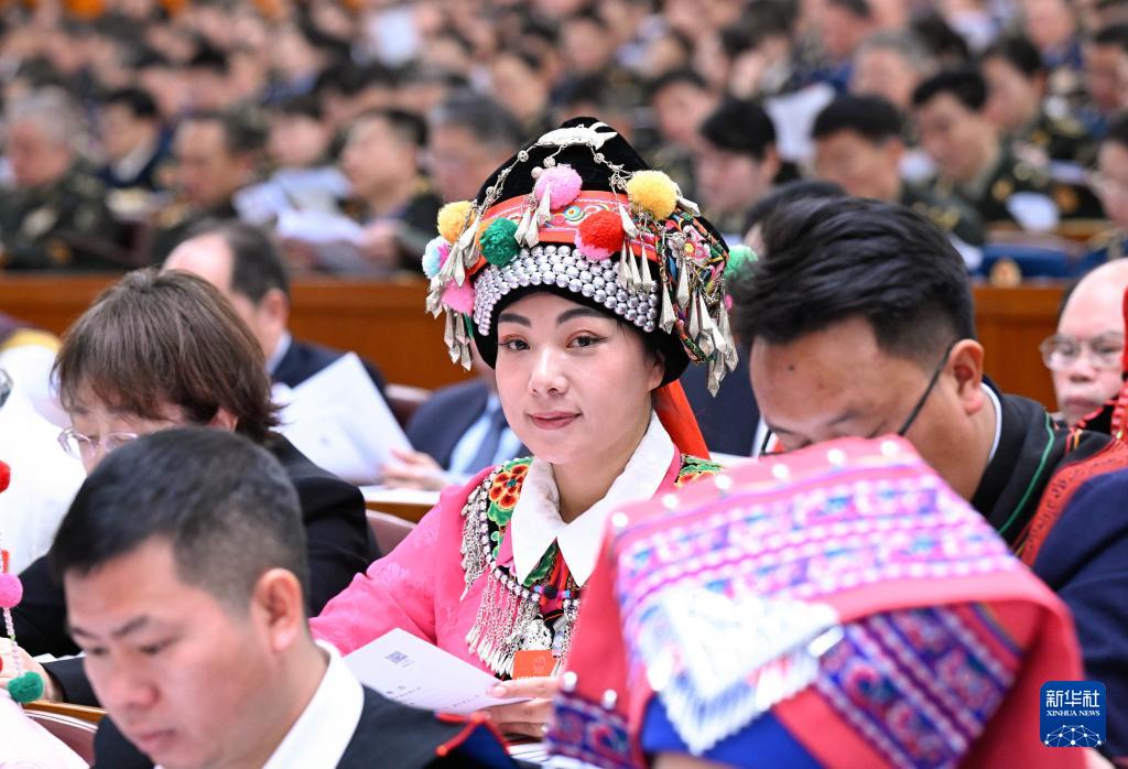3月5日,全国人大代表、贵州省安顺市镇宁布依族苗族自治县六马镇致富村党支部书记、村委会主任卢丹(二排中)在北京人民大会堂出席十四届全国人大三次会议开幕会。