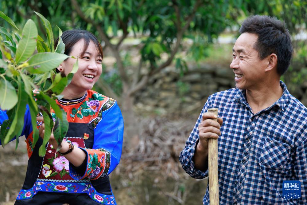 全国人大代表、贵州省安顺市镇宁布依族苗族自治县六马镇致富村党支部书记、村委会主任卢丹(左)在致富村向村民刘发志了解芒果种植情况(2025年2月20日摄)。