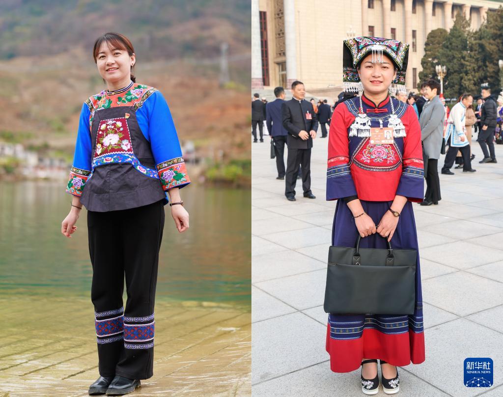 拼版照片:左图为在云南省南涧彝族自治县宝华镇拥政村拍摄的全国人大代表、南涧彝族自治县民族文化工作队队员鲁丽华(新华社记者陈欣波2025年2月7日摄);右图为在十四届全国人大三次会议云南代表团驻地拍摄的鲁丽华(新华社记者郑焕松2025年3月6日摄)。