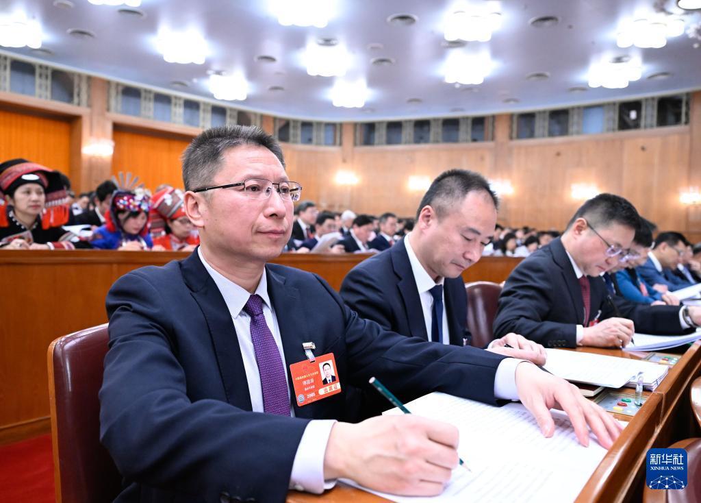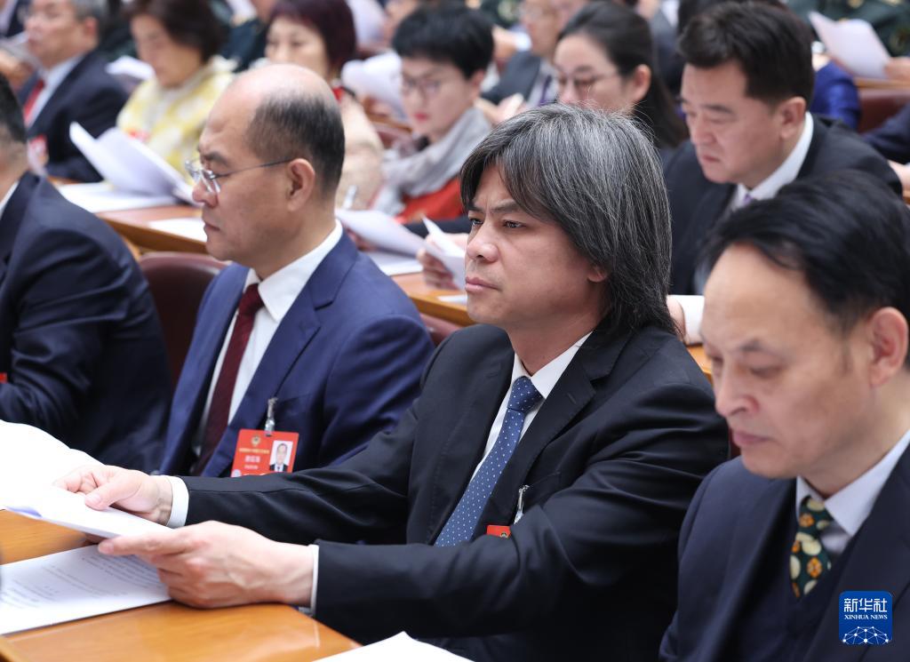 3月5日,全国人大代表、重庆红江机械有限责任公司加工中心特级技师傅国涛在北京人民大会堂出席十四届全国人大三次会议开幕会。