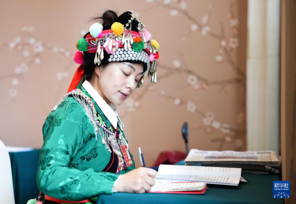 3月6日,全国人大代表、云南省南涧彝族自治县民族文化工作队队员鲁丽华在北京的驻地做笔记。