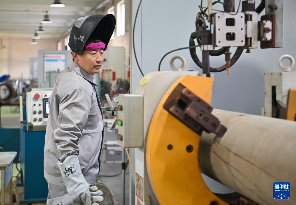 在中石化第四建设有限公司工匠学院,全国人大代表、中石化第四建设有限公司工匠学院焊接教练张振连操作自动焊机(2025年2月21日摄)。