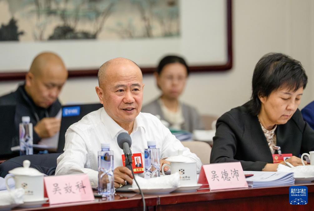 3月6日,全国政协委员、河北翰鼎雕塑集团首席技师高英坡(右一)在北京的驻地参加文化艺术界小组讨论。