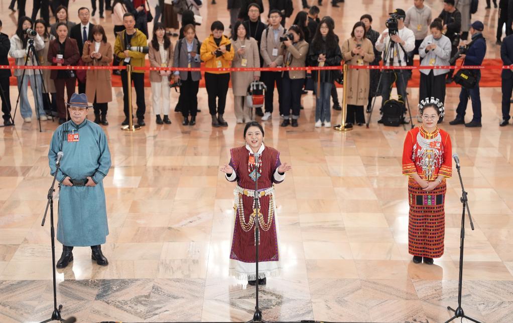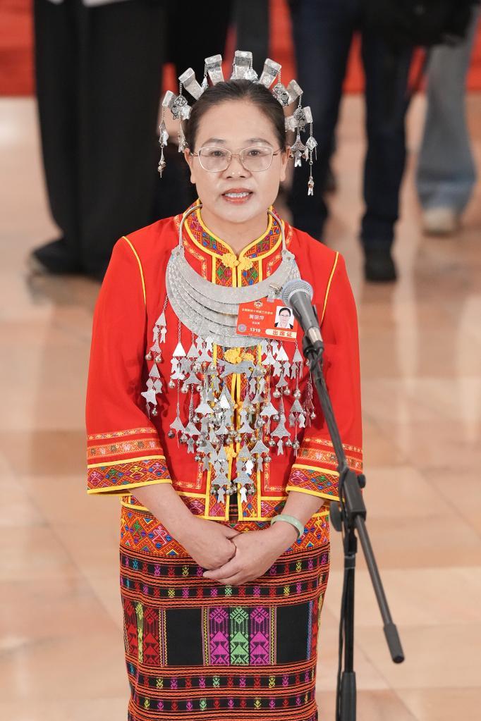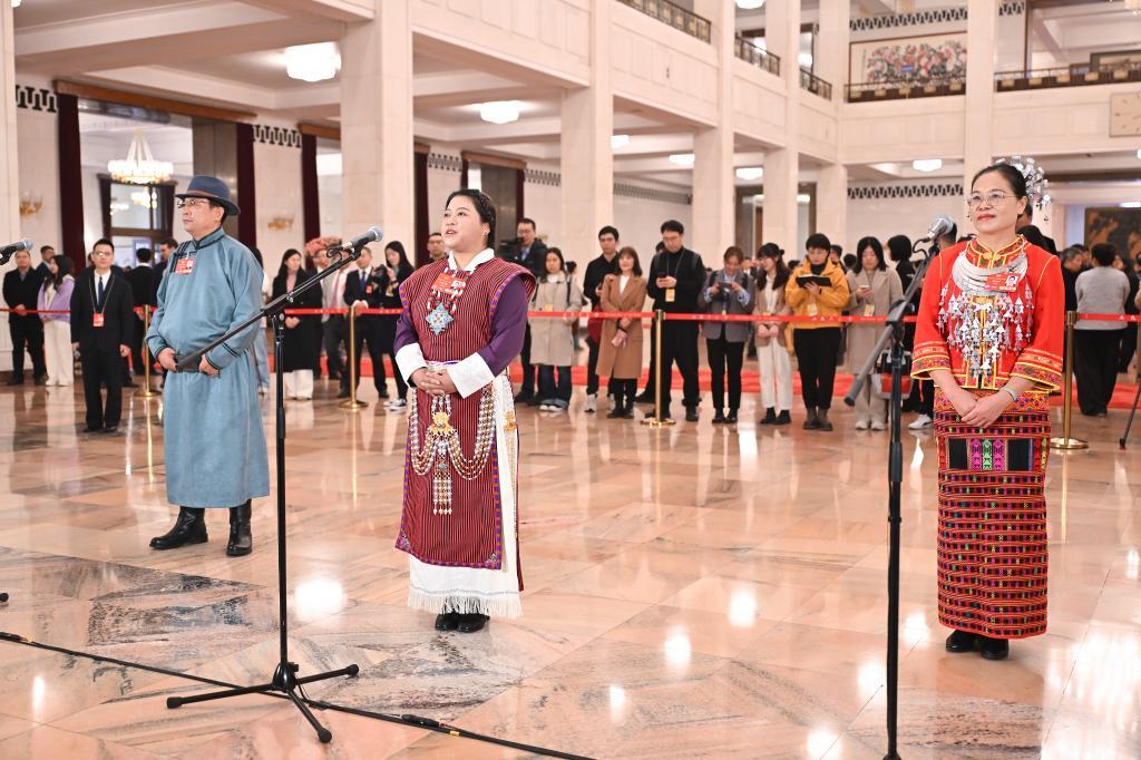 3月10日,全国政协十四届三次会议第三场“委员通道”集体采访活动在北京人民大会堂举行。这是全国政协委员白玛玉珍接受媒体采访。