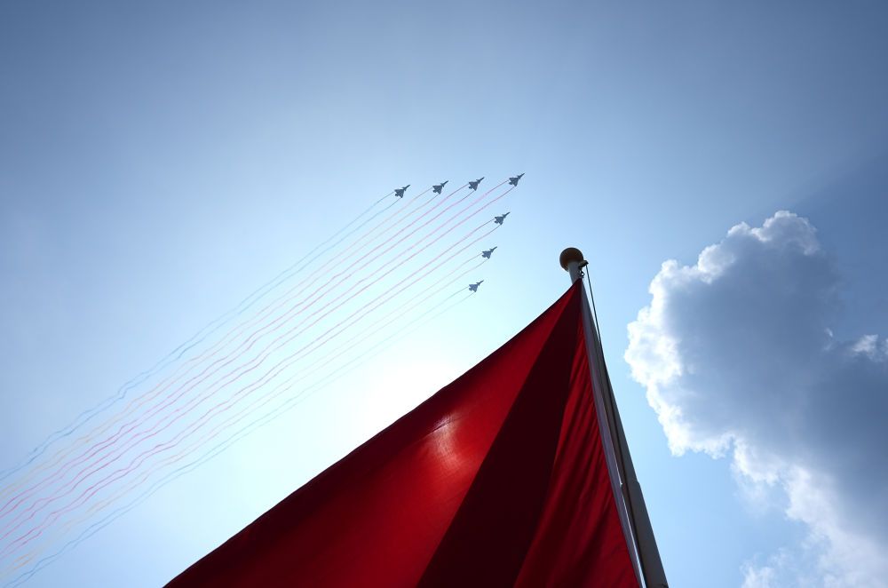 2025年9月3日,纪念中国人民抗日战争暨世界反法西斯战争胜利80周年大会在北京隆重举行。这是教练机梯队接受检阅。新华社记者 朱峥 摄