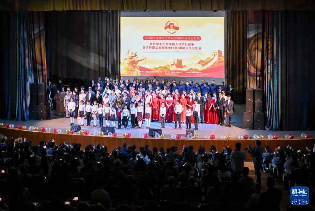 这是9月21日在俄罗斯莫斯科国立师范大学拍摄的留俄学生纪念中国人民抗日战争暨世界反法西斯战争胜利80周年文艺汇演现场。新华社记者 郝建伟 摄